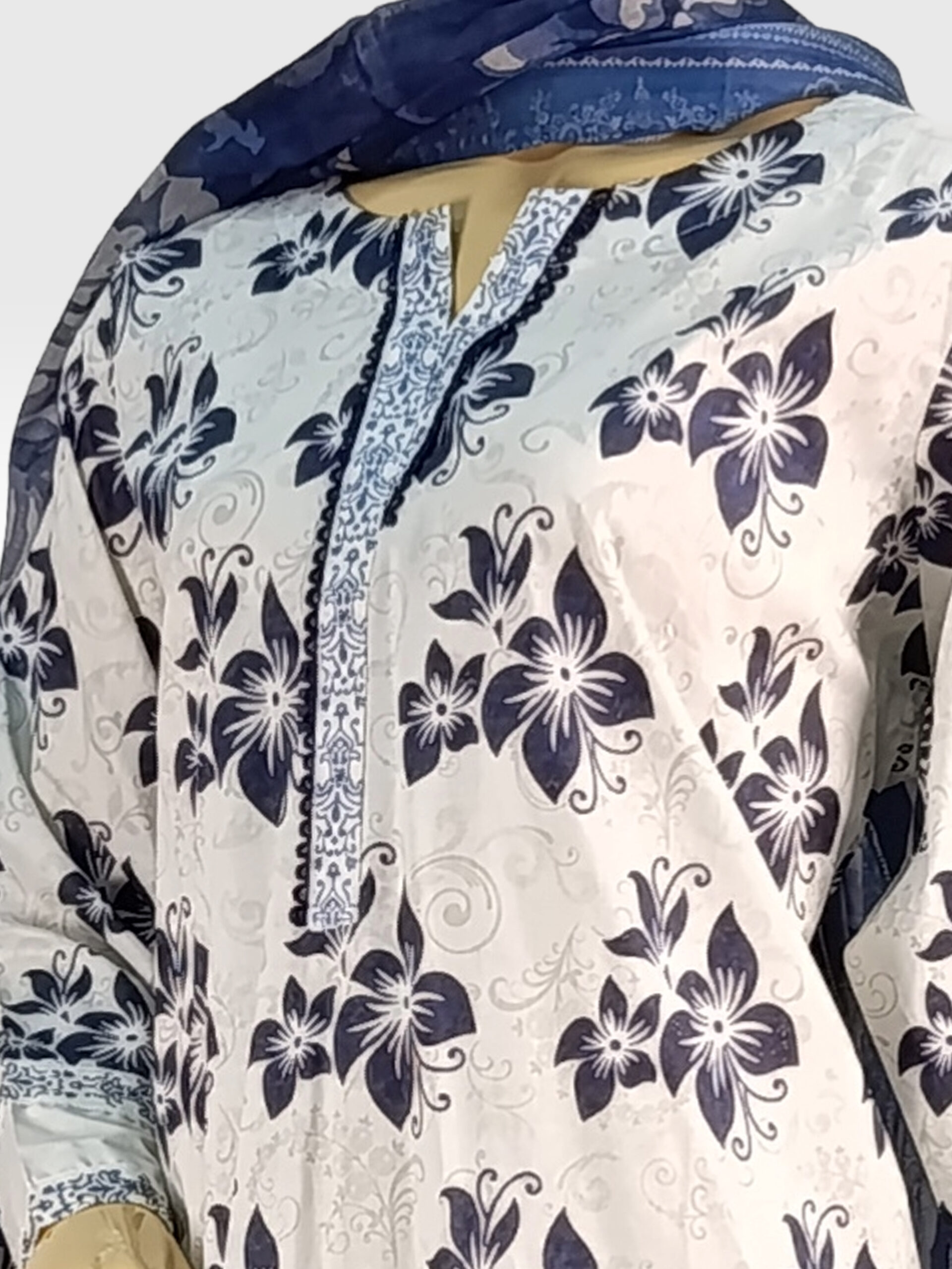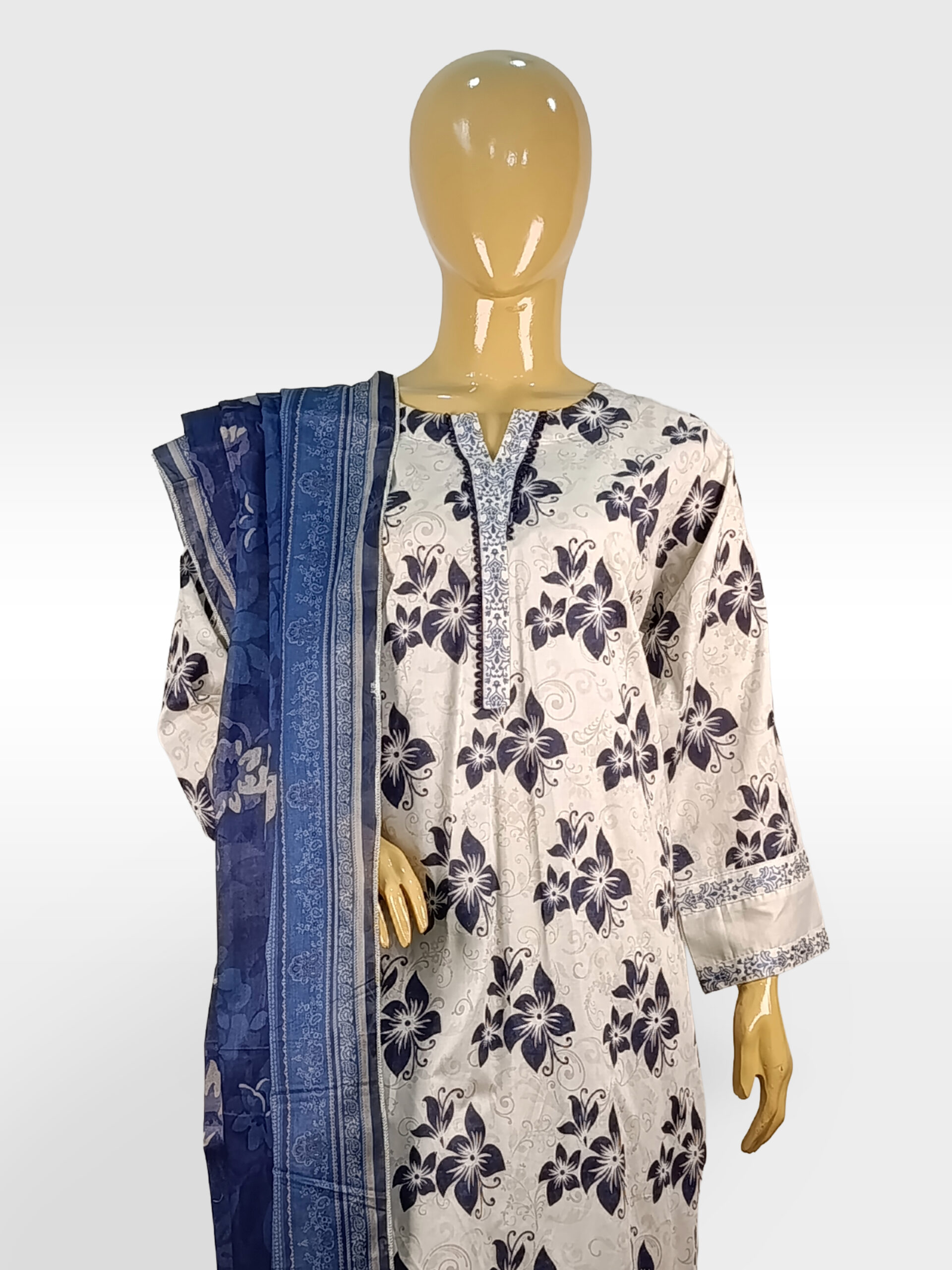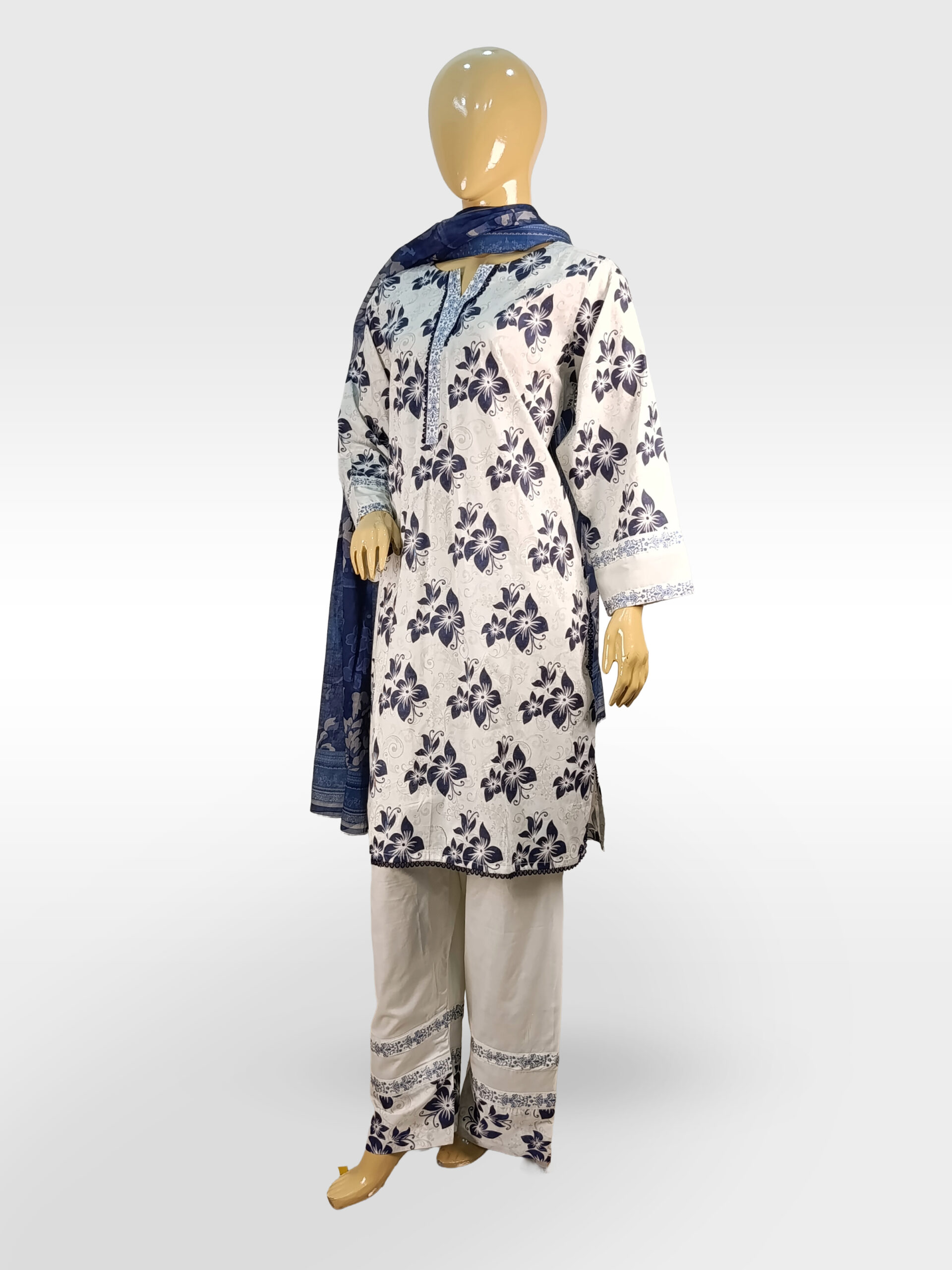 Lightweight Dupatta: Includes a semi-sheer, deep blue dupatta with a subtle textured print, providing a beautiful tonal layer to the white and navy outfit.