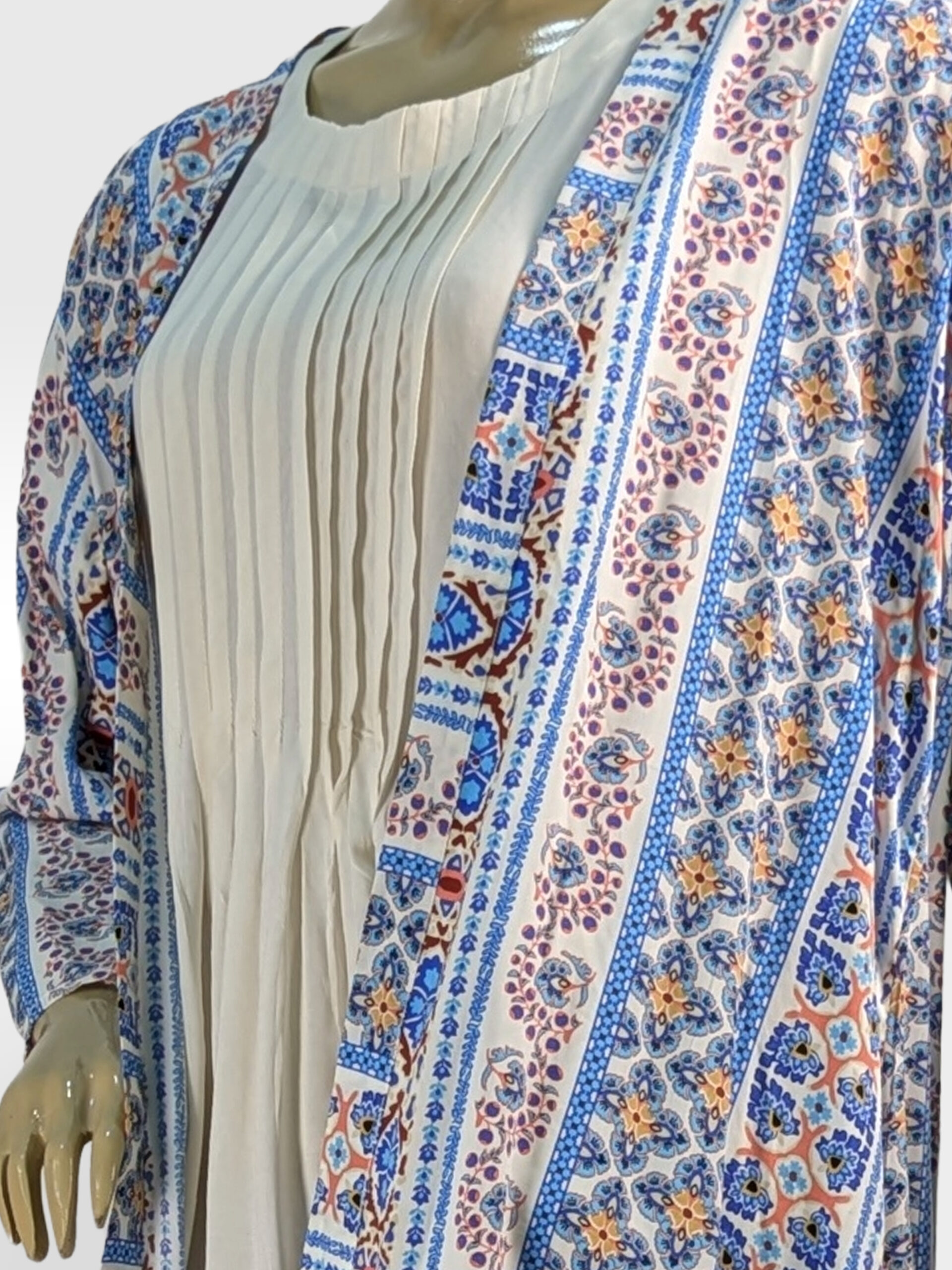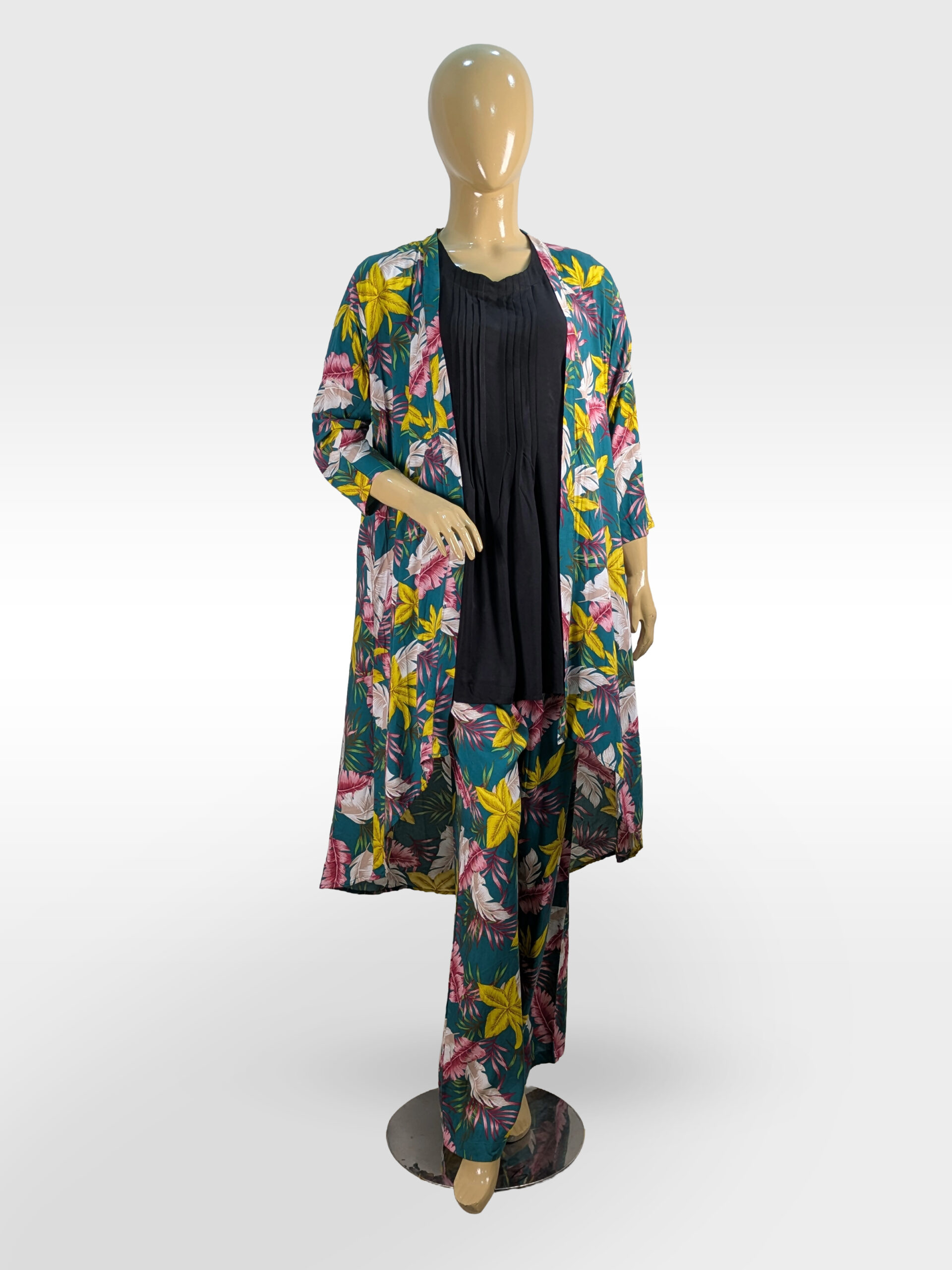 Flowing Outer Gown: A long, open-style gown with a relaxed fit and three-quarter sleeves, featuring a lush print of yellow, pink, and white tropical leaves.
